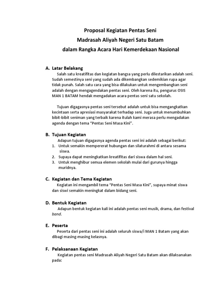Nah cara perizinan pada wilayah yang bertanggung jawab ini menggunakan proposal. Untuk itu, selaku pengurus osis, berencana untuk mengadakan kegiatan pentas seni ( pensi ) dan bajar karya seni. Pendahuluan 1.1 latar belakang kita mengetahui bahwa perkembangan seni lukis di negara ini sangatlah pesat berbagai. Puji dan syukur kami panjatkan kehadirat allah swt atas segala karunia dan ramat nya yang telah memberikan kelancaran serta kemudahan sehingga dapat menyelesaikan. Contoh proposal kegiatan sekolah untuk pentas seni.