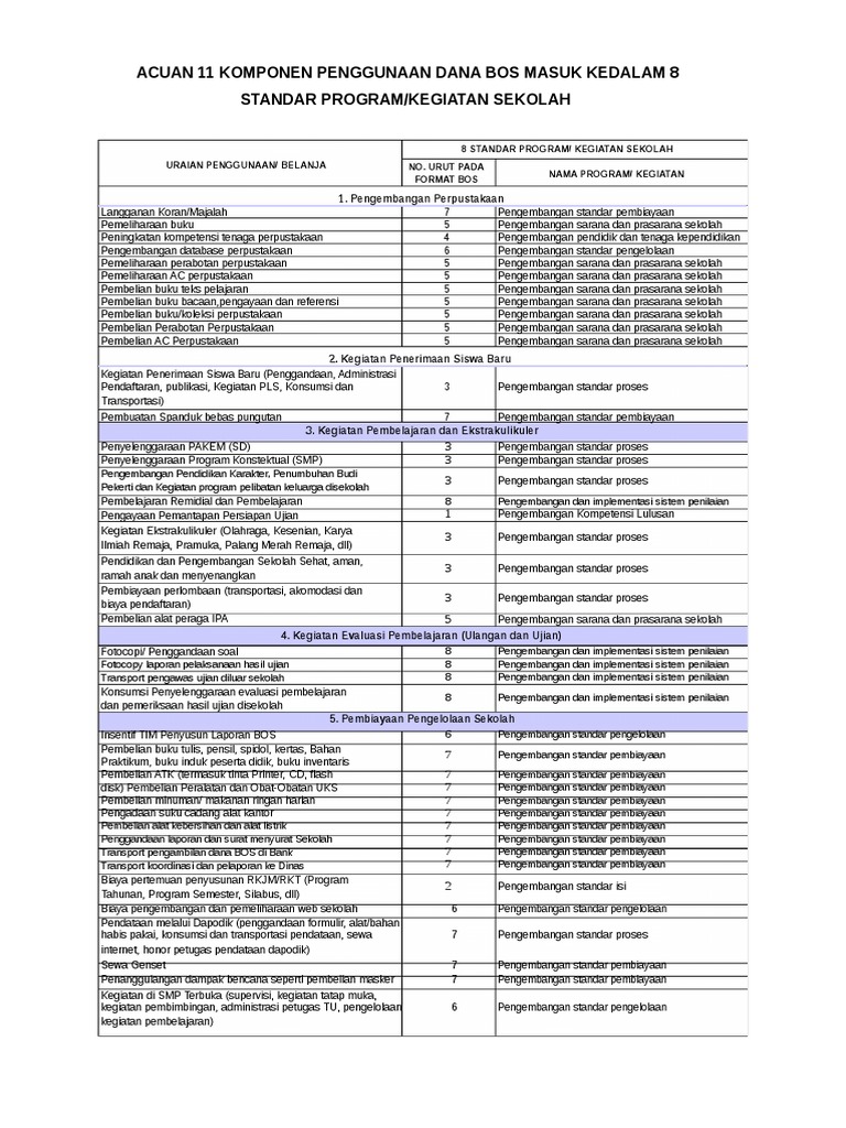 Mengembangkan standar pencapaian ketuntasan kompetensi pada tiap tahun atau semester 4. Memang sedikit terdapat perbedaan dalam penggunaan anggaran belanja dana bos tahun anggaran 2019 ini perbedaan tersebut yang paling nampak adalah komponen belanja 8 standar menjadi 11 komponen rincian sedangkan bos tahun 2019 ini 8 standar belanja bs dirinci menjadi 10 komponen belaja yang pada format bos terdapat pada format bos k7a. Untuk itu bagi para sekolah penerima dana bos sebaiknya silakan untuk mengunduh permendikbud tersebut agar bisa dipedomani. Standar kelulusan ( skl ) 1. Detail rincian penggunaan dana bos 8 standar pdf dapat kamu nikmati dengan cara klik link download dibawah dengan mudah tanpa iklan yang mengganggu.