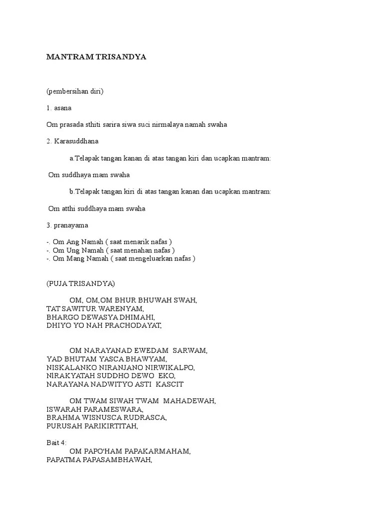 Om om om bhur bhuwah swah, tat sawitur warenyam, Trisandya terdiri dari dua kata, yaitu "tri" artinya tiga,. Jadi trisandya artinya sembahyang tiga kali sehari. Om om om bhur bhuvah svah tat savitur varenyam bhargo devasya dhimahi dhiyo yo nah pracodayat terjemahan: Trisandya terdiri dari dua kata yaitu "tri" artinya tiga, "sandya" artinya sembahyang.